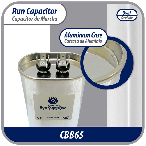 Appli Parts Run Capacitor for ac 50 Mfd uF (microfarads) 370VAC CBB65 Oval Universal fit for hvac and other applications in High in Wide CON-50-370