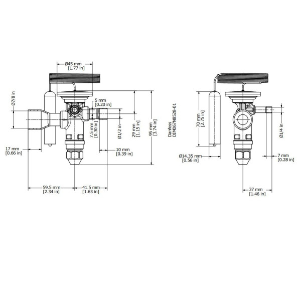 Danfoss 067N2154 6TR Thermostatic expansion valve, TGE, R22,R407C, 1/2x7/8 in Solder, ODF, 1/4 in Externally equalized, Bi-flow, -40 to 50 F, replaces 067N2174