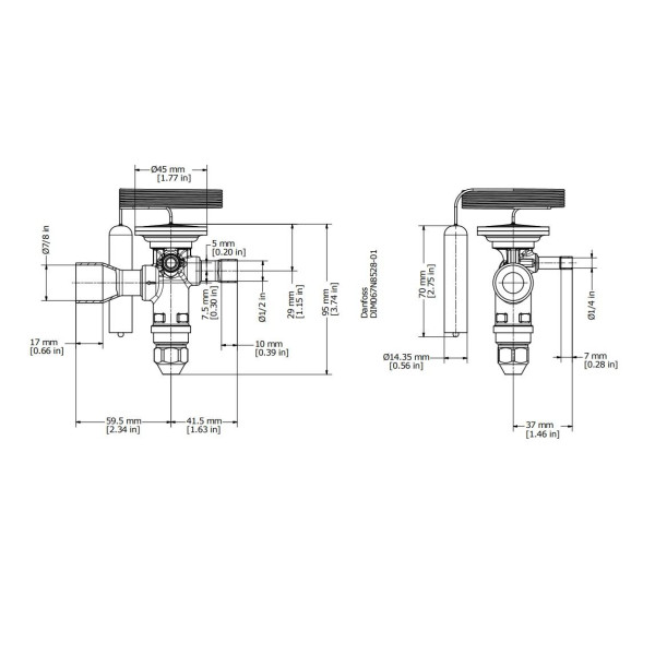 Danfoss 067N3152 4.5TR Thermostatic expansion valve, TGE, R410A,R32, 1/2x7/8 in Solder, ODF, 1/4 in Externally equalized, Bi-flow, -40 to 50 F replaces 067N3172