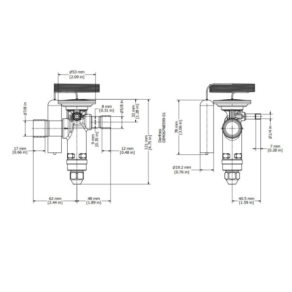 Danfoss 067N3159 15TR Thermostatic expansion valve, TGE, R410A,R32, 5/8x7/8 in Solder, ODF, 1/4 in Externally equalized, Bi-flow, -40 to 50 F replaces 067N3179
