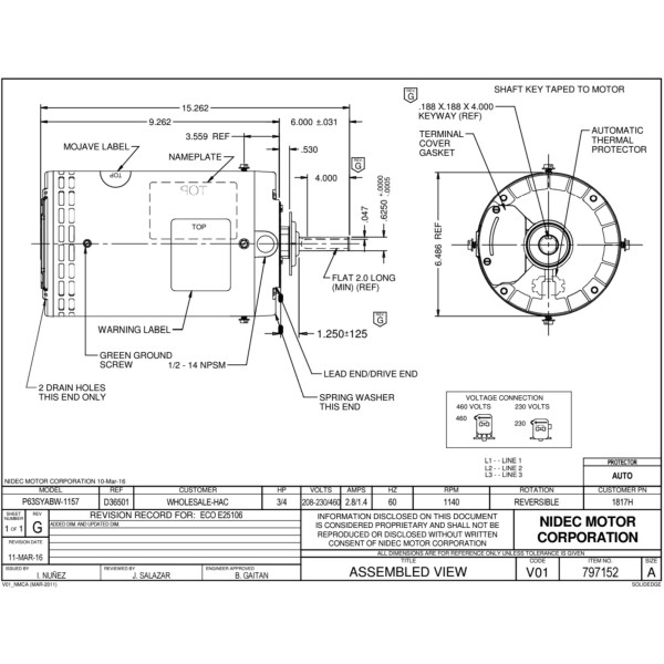 US Motors Mojave 3/4 hp 1140 rpm, 6 poles, 1 shaft, OAO Enclosure, 1 speed, 6.3 diameter, Reversible, 208-230 V/460 V, 60 hz, 3 ph, 1817H P063ABW1157015B X501