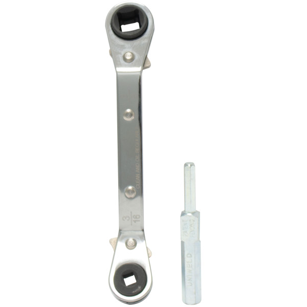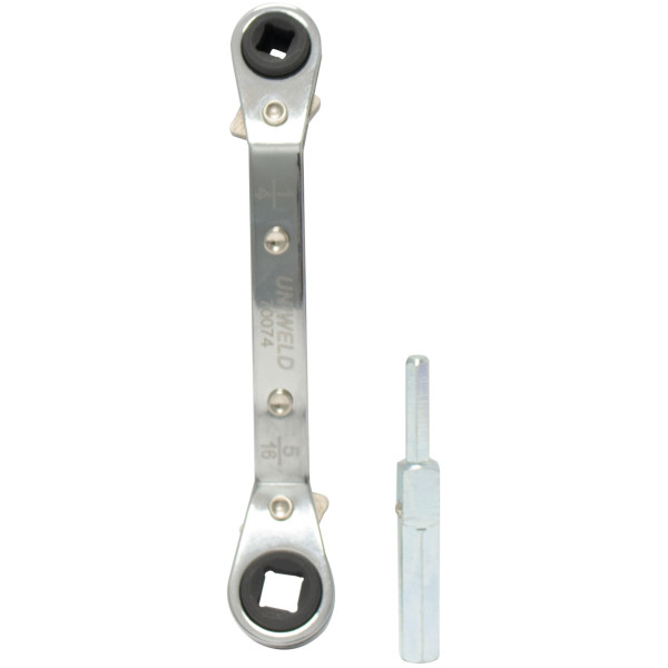 Uniweld 70074 Offset Ratchet Wrench, 1/4 and 3/16 in Square opening, 3/8 and 5/16 in Square opening, with 3/16 and 5/16 in Dual Hex Valve Adapter