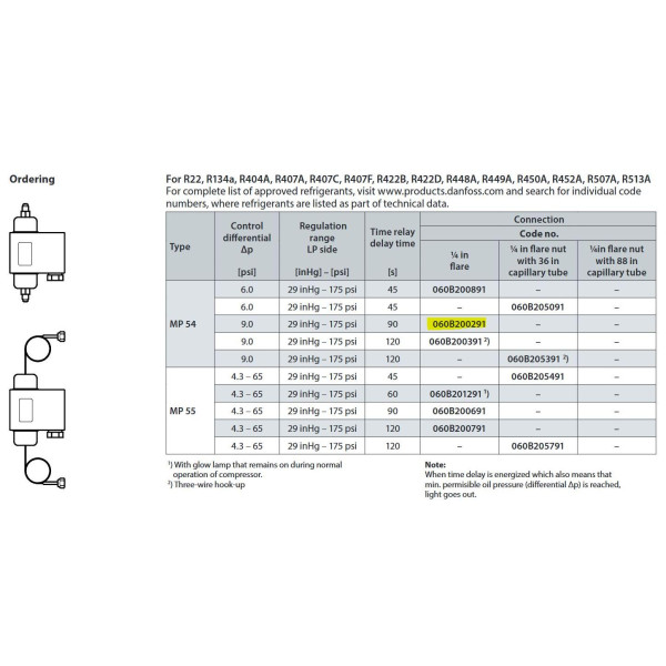 Danfoss 060B200291 Control de Diferencial de Presion de Aceite MP54, Control de Diferenacial 9 Psi, Rango de Regulacion Baja Presion 29 inHg -175 psi, Tiempo de Retardo 90 Seg, 1/4 pulg Flare M 060B200266