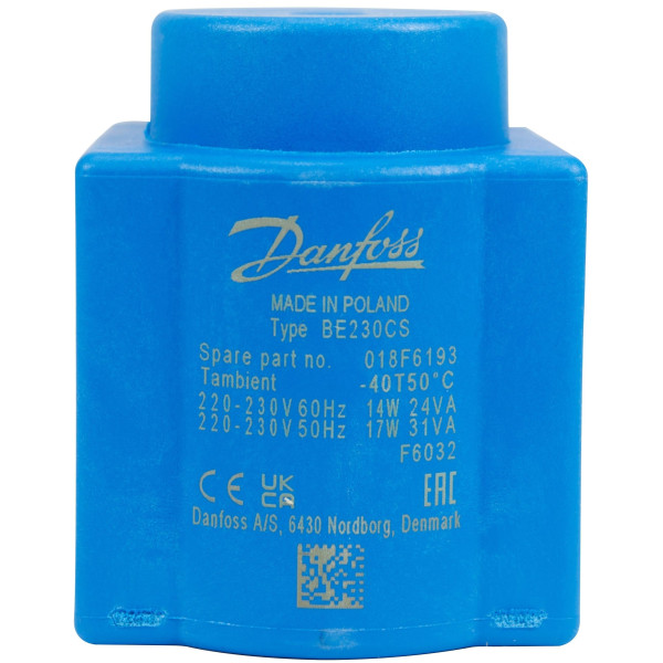 Danfoss 018F6732 Bobina para Solenoide 220-230 V, 60 Hz, 14 W, 50Hz, 17 W, IP67, BE230CS, Caja de Conexion, Sirve para Valvulas VDH y VDHT, identico 018F8732, 018F7919